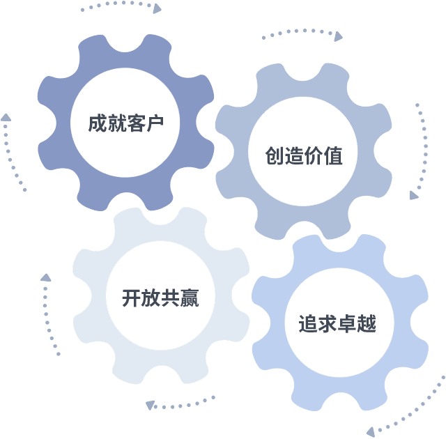成就客户是一切决策的出发点,,,,创造价值是衡量所有工作的标准,,,,追求卓越是我们做事做人的态度,,,开放共赢是我们的格局也是最终的结果。。价值观的齿轮环环相扣,,推动着组织里的每个人不断向前。。
